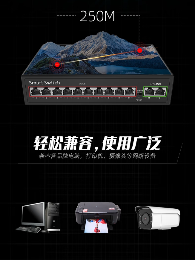 传输速度:速度快一次接8台poe监控设备 稳定性:目前无卡顿连接也比较快 操作难易:即插即用简单方便 做工质量:用料考究 外形外观:简约大气 其他特色:一次点亮,完美运行